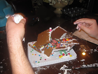 Jacob bought us a Gingerbread house kit and we thought this would be a wonderful family home evening. I should have known from these first two pictures that this was not going to be a good experience....