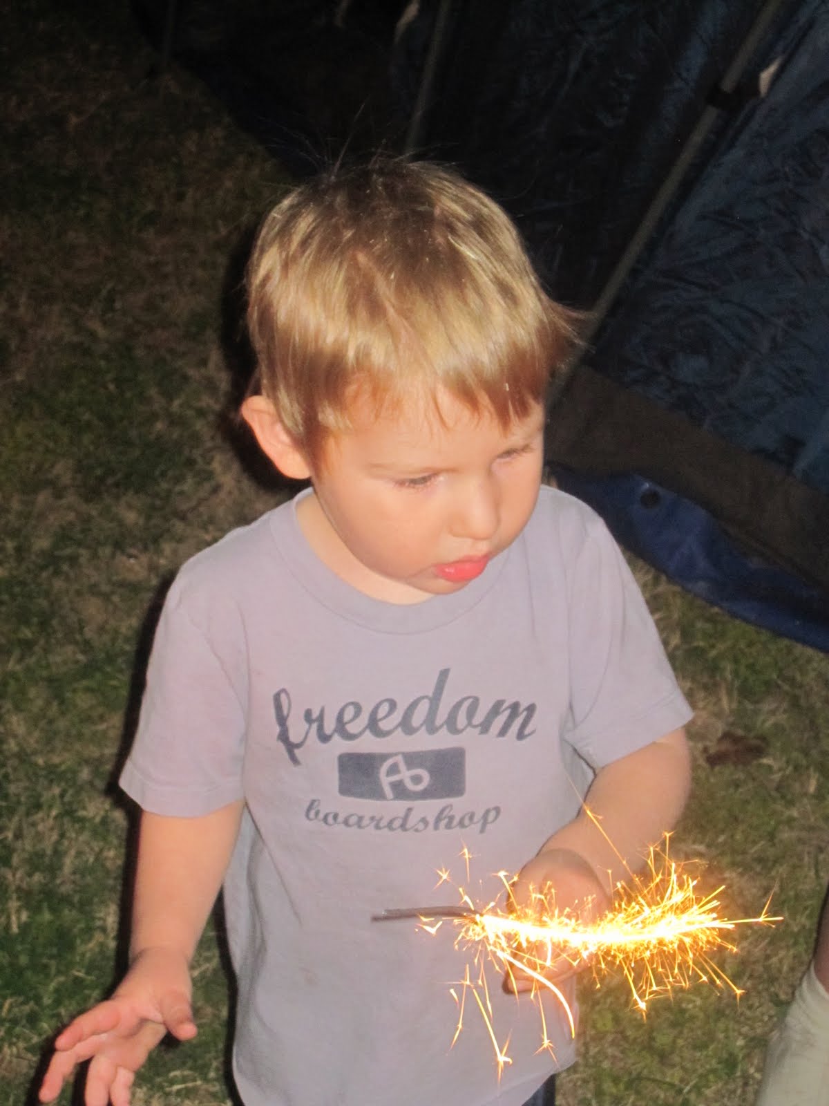 Last weekend Jacob went on a camp out with the Scouts. I am not sure if it got his camping blood flowing our what, but he got it into his head that he HAD to have a camp out with Eli. Jacob made all this wonderful plans to make sure Eli had the best experience. It started off with inviting Ethan and Austin over (Austin feel asleep and didn't make it over). Then they helped daddy put up the big tent. Liam even got in there and tried to help out. We then make a yummy stake and potato dinner followed up with cobbler...which the boys made in the dutch over (and by boys I mean Ethan and Eli) Liam also tried to help make this. The Ash's included aunt Julie even came over and had dinner with us. It was so yummy! We also let the boys play with a few sparklers when it got dark. Just before bed time Jacob and the boys came inside and watched Annie which both boys really enjoyed. Then they went out and slept in the tent. I am impressed no on came inside and no one even wanted to. They loved it out there and even slept pretty good. Jacob said it was the cutest thing when Eli woke up because he didn't really know where he was then he opened his eyes really big and said, "wow! Tent!" Then to make a perfect ending to a perfect camp we make breakfast burritos
